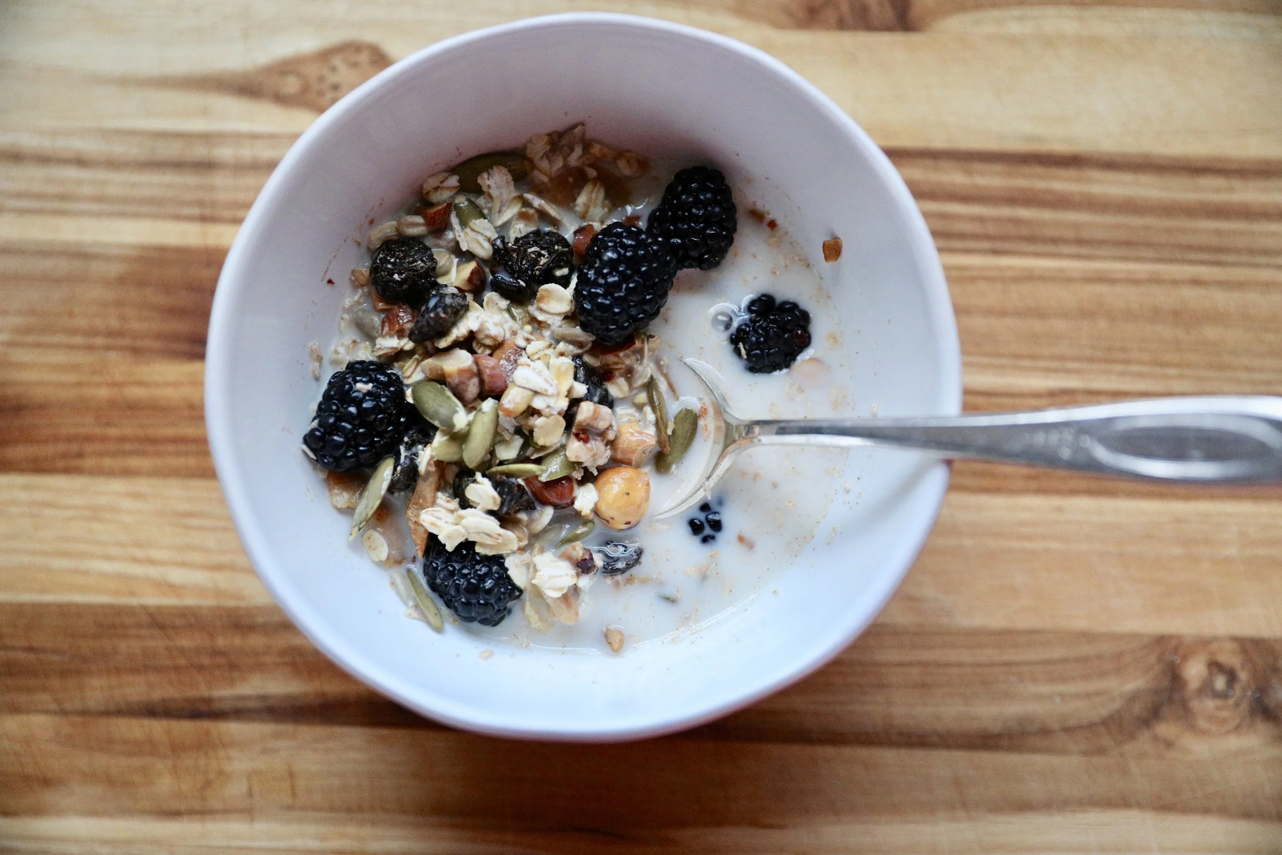 When I first had this muesli, I was at a bed and breakfast in Vermont last fall, and I was hooked. It's the perfect balance of mixed toasted nuts, oats, seeds and dried fruit, offering a contrast of flavors and a healthy delicious bowl of yumminess. You can add grated apple to make the traditional Bircher Muesli, here I added blackberries and that was perfect.